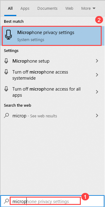 1) In the Windows Search box, type microphone, and select Microphone privacy settings.