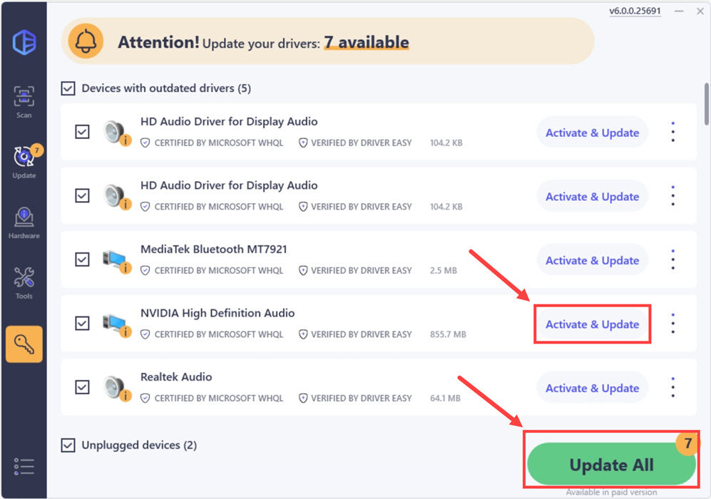 3. Click Activate & Update button next to the NVIDIA high definition audio driver to update the correct version of this driver. Or click Update All button to download and update all drivers at a time automatically.
