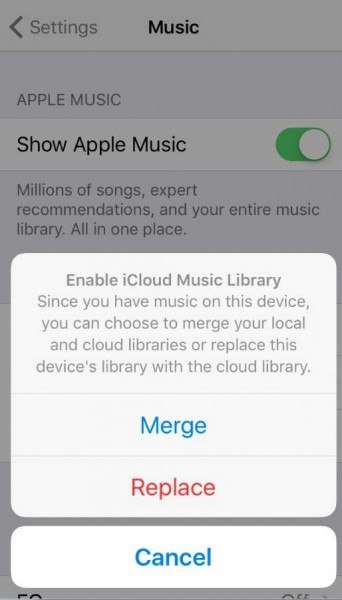 If you choose Replace, the music in your Apple Music library will replace all of the music on your iPhone.