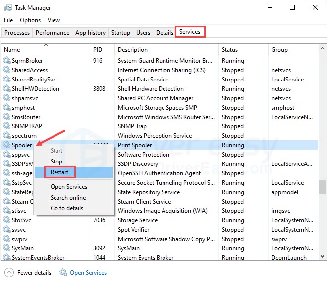 - Go to the Services tab, scroll down and find Spooler. Right-click it and select Restart.