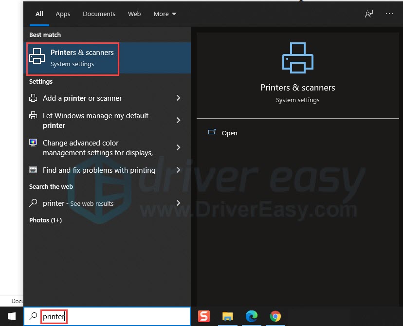 - In the search bar next to your Start button, type printer, and click Printers and scanners.