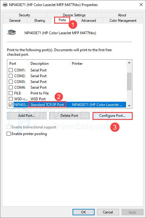 - Go to the Ports tab, select the TCP/IP port, then click Configure Port.